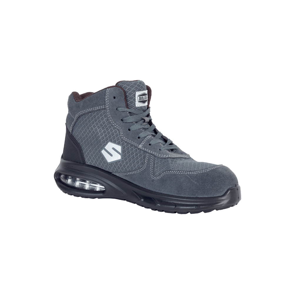 es Chaussures de sécurité SOLIDUR ARIA02 combinent respirabilité, confort et protection grâce au cuir de vachette finition velours et aux inserts en mesh.