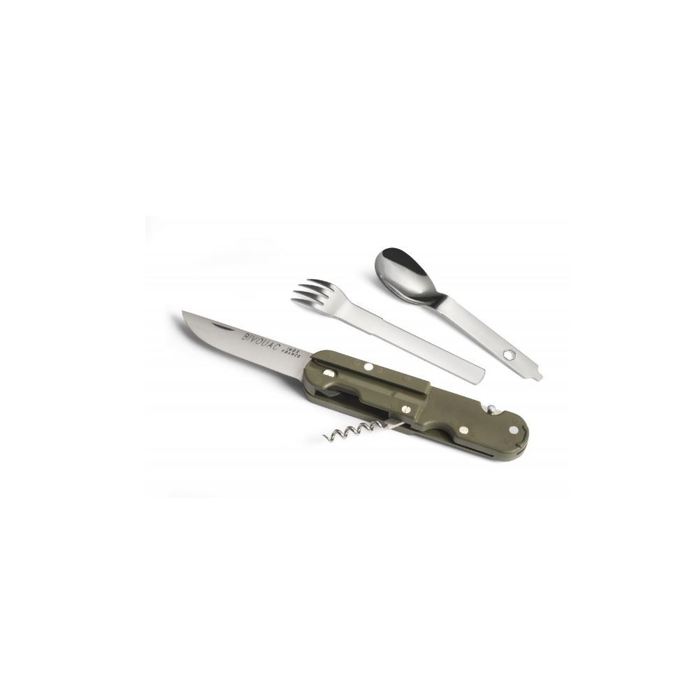 Idéal & Pratique pour vos Pique-niques avec Fourchette, Cuillère, Décapsuleur, Ouvre-boîte et Tire-bouchon, le couteau multifonctions BIVOUAC est fabriqué à Thiers par le Coutelier français Tarrerias-Bonjean.